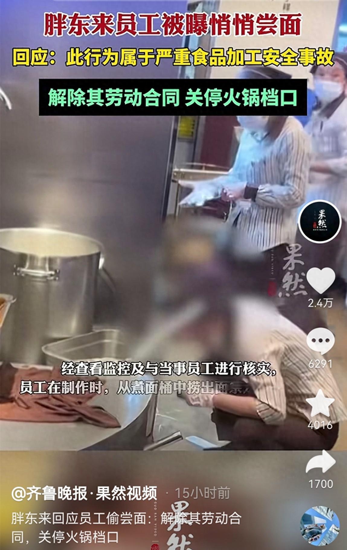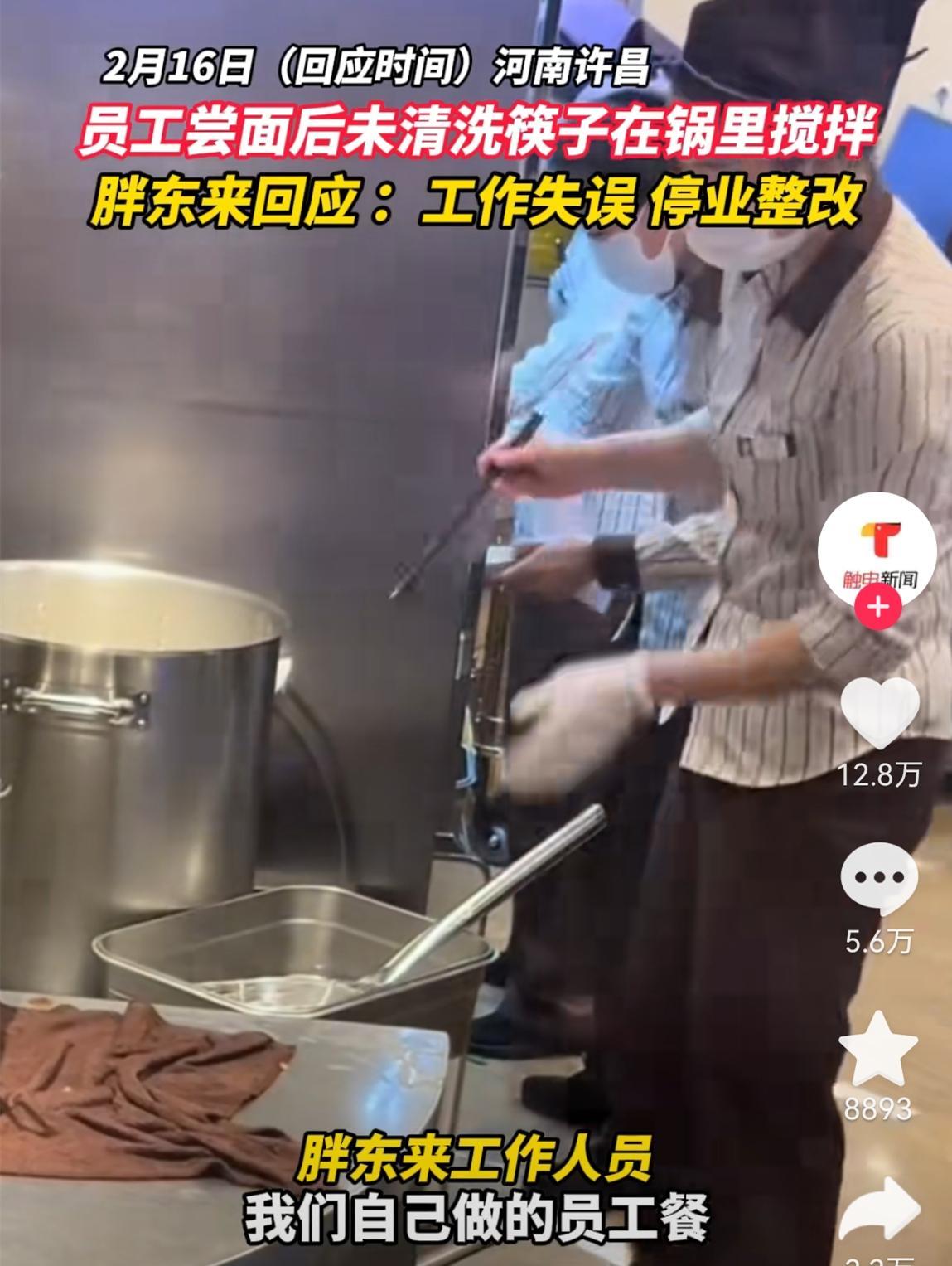 胖東來的工作人員表示公司正在落實處理此事,直言當時女員工在做內部喫的員工餐,目前對涉事餐飲店作出停業處理。