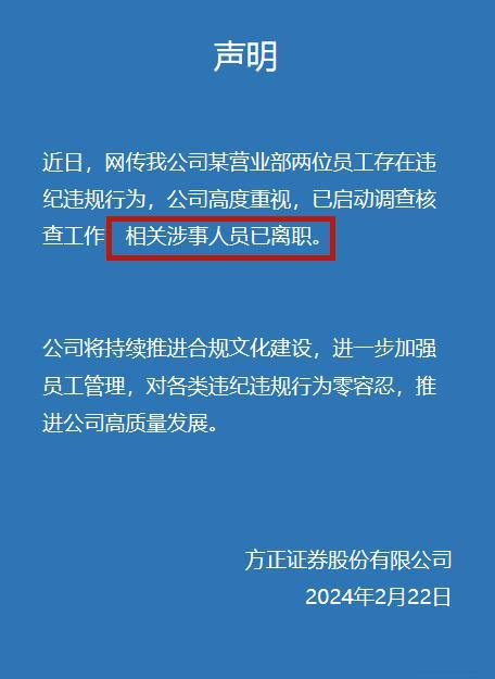到了傍晚,方正證券針對此事發布聲明,直言相關涉事人員已經離職,公司對此事高度重視,已啓動調查覈查工作,公司對各類違紀違規行爲零容忍。