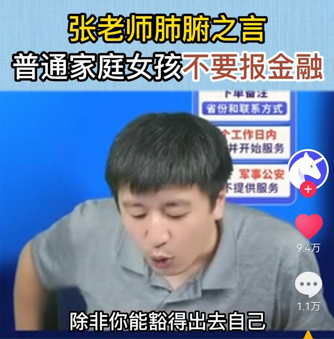 據瞭解,張雪峯曾說女生在填大學志願時普通家庭女孩不要報金融,他說“除非你能豁得出去自己。”