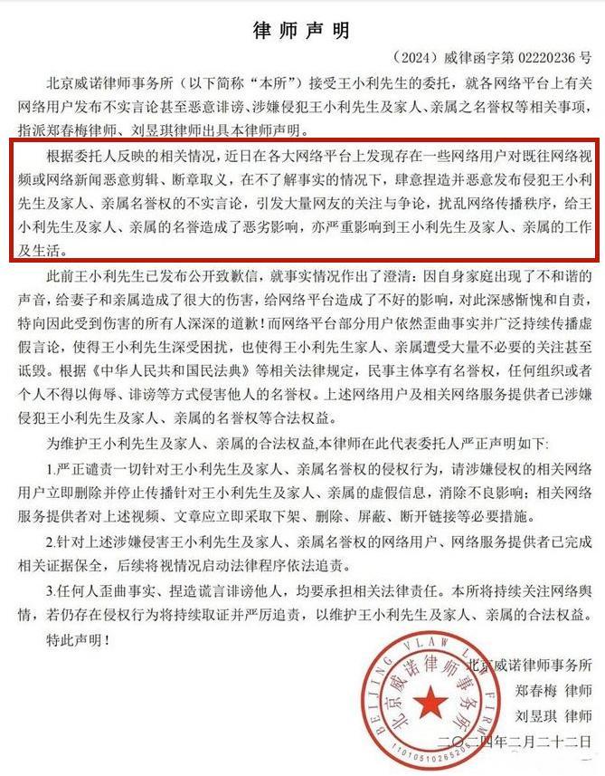 最終2月22日,王小利發佈了律師聲明,稱網上很多關於他家事的信息屬於不實傳聞,這些不實信息已經影響到了他和家人、親友的生活和工作。