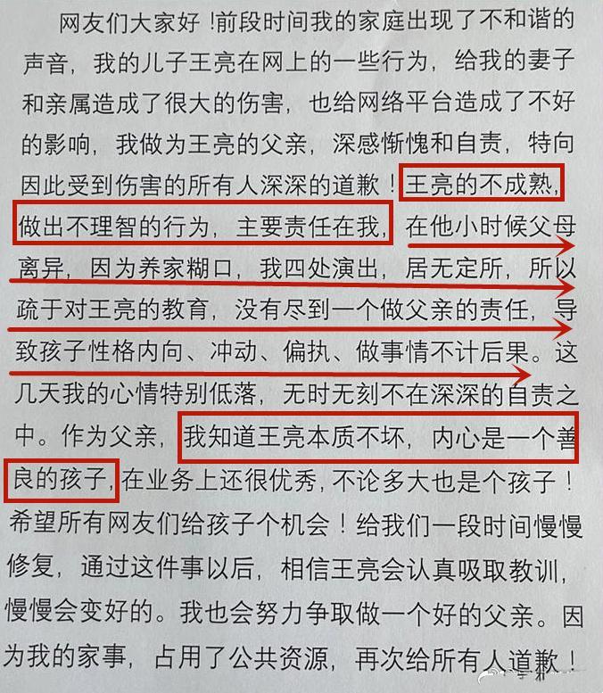 他還說王亮本質不壞,內心非常善良,希望網友們能給孩子一次機會,也給他們一段時間慢慢修復父子關係。