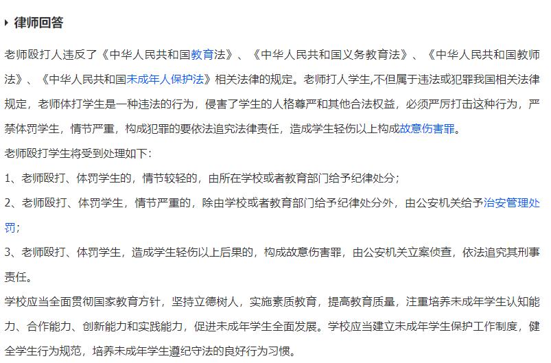 她已經違反了《教育法》《教師法》《未成年人保護法》中的一些法律條款,涉嫌構成故意傷害罪,最終有可能被立案判刑。