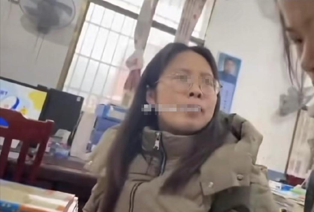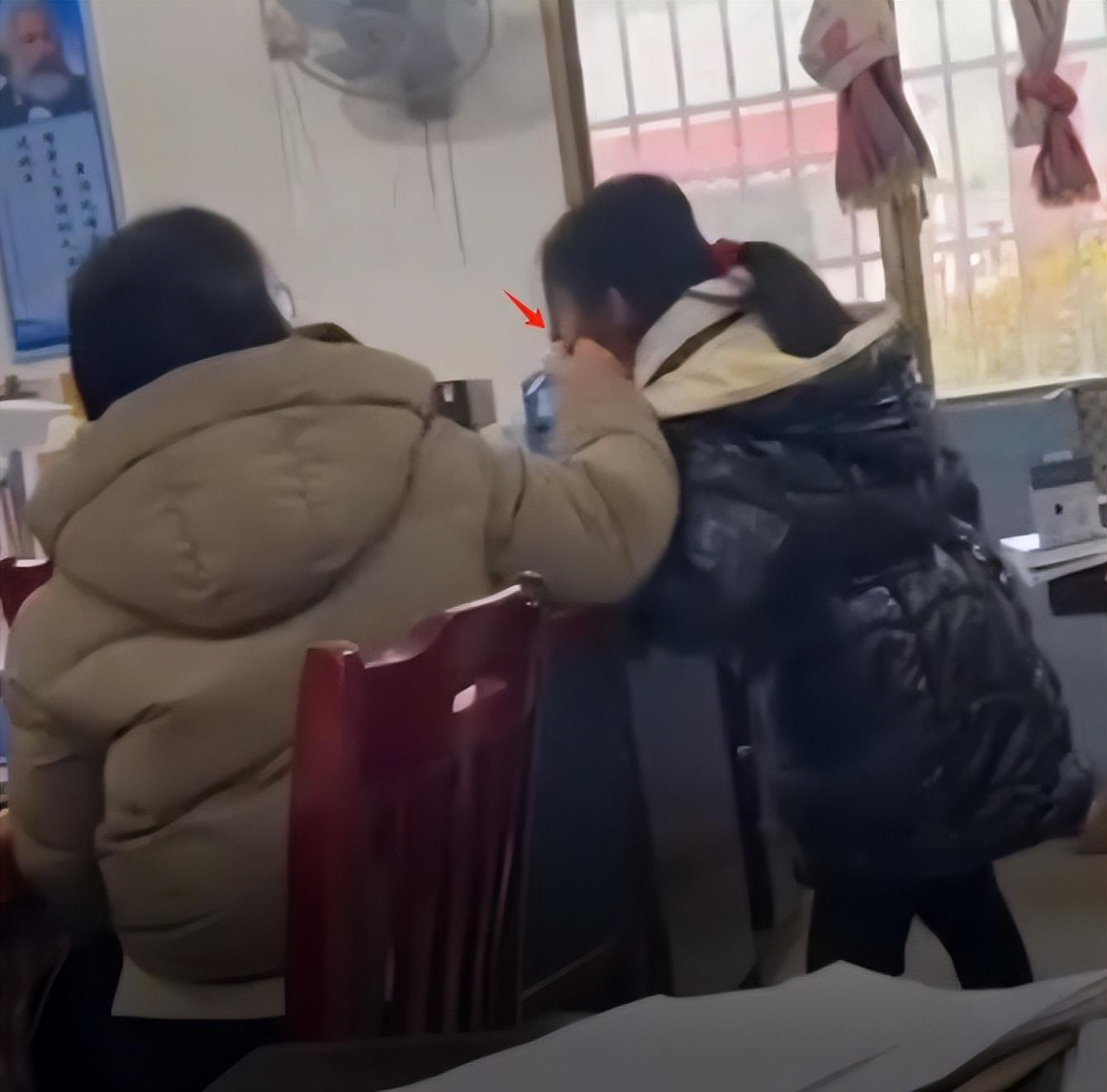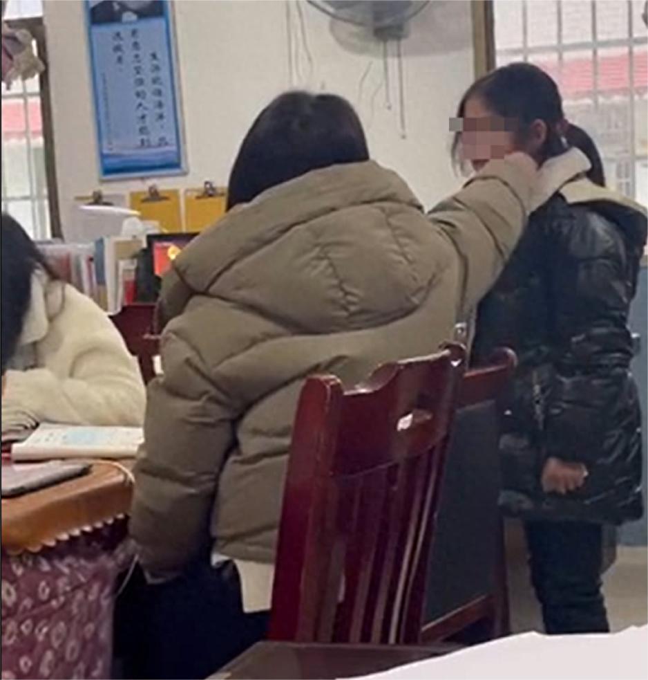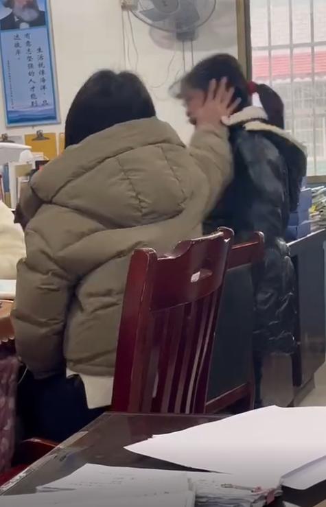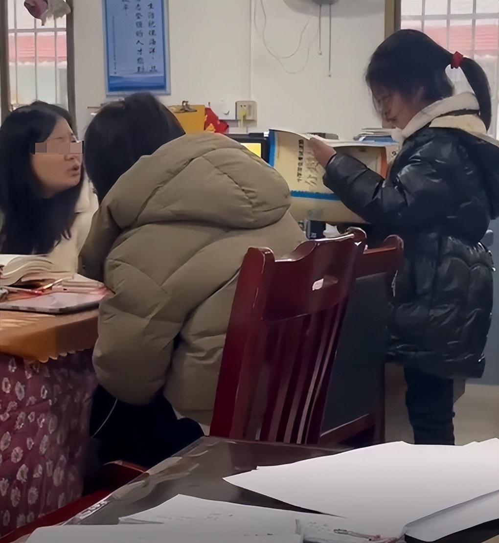從視頻中可以看到,兩位女老師坐在辦公桌前,其中一名戴着眼鏡,穿着褐色羽絨服的女老師旁邊站着一名大約八九歲左右的女學生。