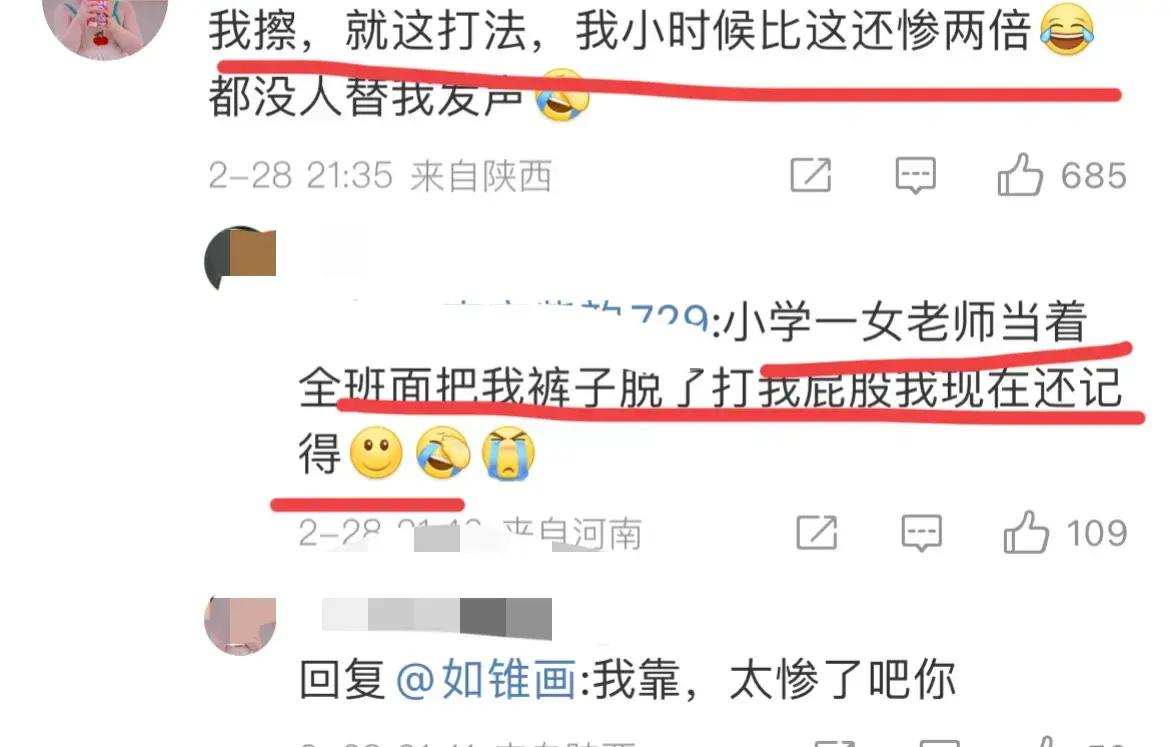 還有網友說他小學的時候被女老師當着全班的面脫掉褲子打屁股。