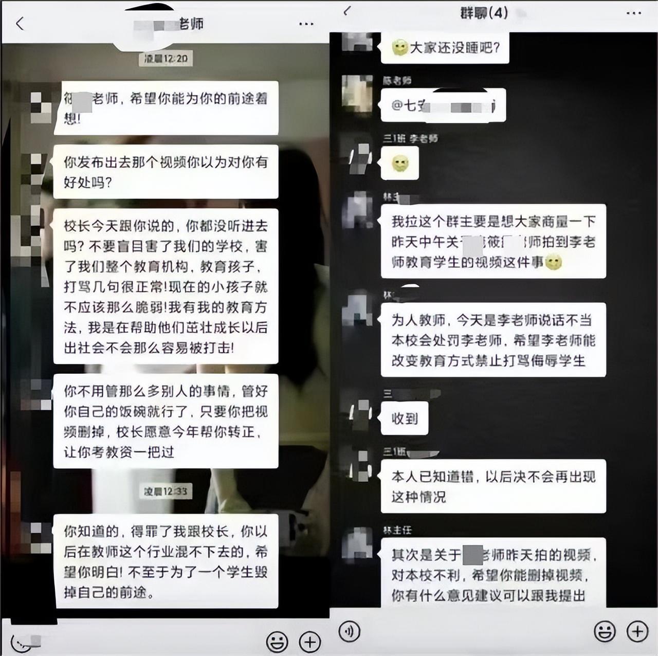 在曝光的聊天截圖中,李老師威脅拍攝了涉事視頻的女老師,說她得罪了她和校長,以後在教師這個行業會混不下去,還說她不至於爲了一個學生毀掉前途。