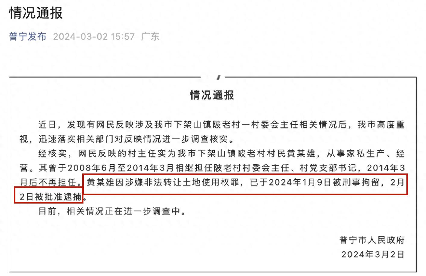 在普寧陂老村前村書記黃俊雄被曝侵佔土地的事件登上熱搜一天後,普寧官方就針對此事發布了情況通報。
