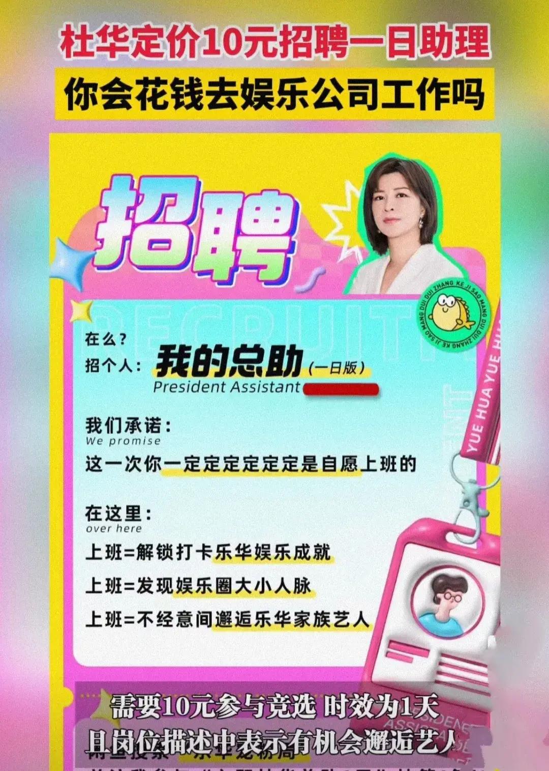 據悉,杜華在社交平臺發佈了招聘助理的信息,應聘條件需要10元參與競聘,並且對崗位進行描述,可以邂逅樂華家族藝人。(值得注意,只是一天而已)