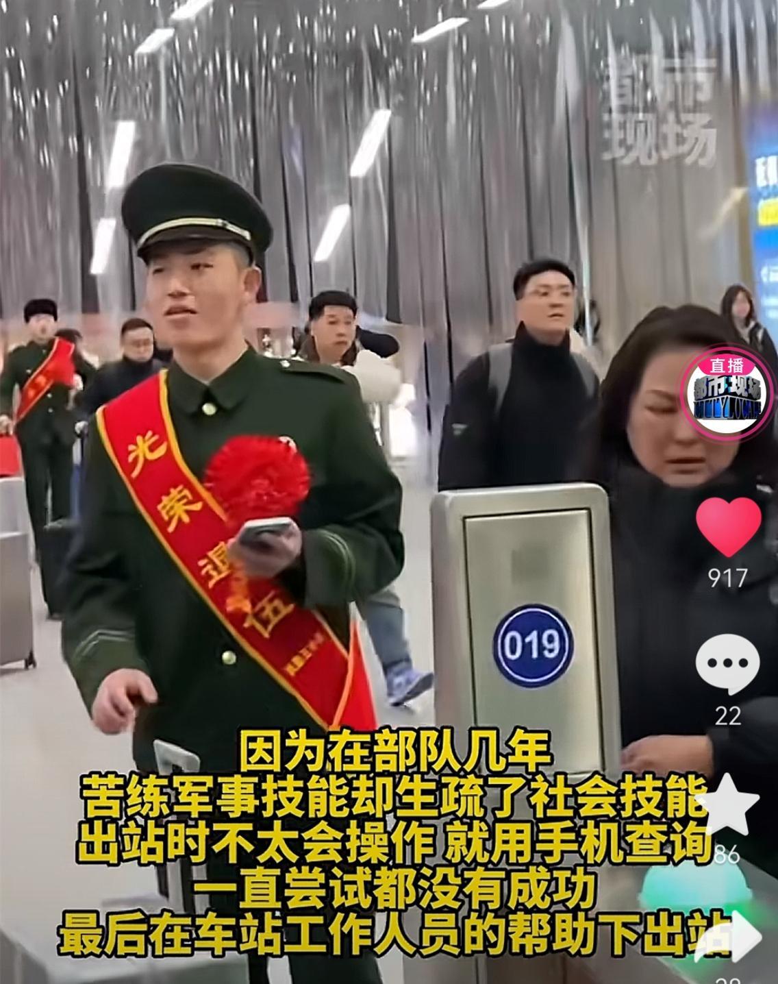 第三個問題,視頻中的退伍士兵大概率很少回家,所以才遇到不會出站的情況。