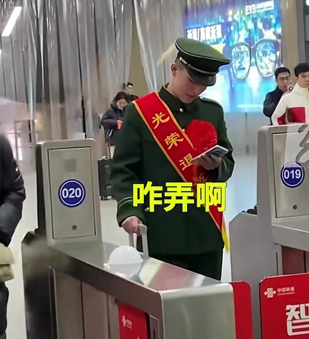 眼見這邊出站閘口不行,這位退伍士兵就更換了一個通道。