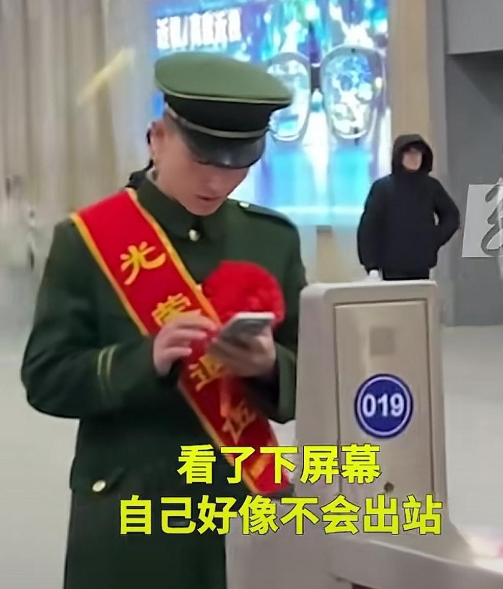 面對如此情況,這位退伍士兵拿出手機站在出站閘口旁研究了很久。
