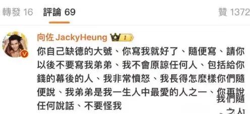 向佐直接在大V的評論區留言,坦言非常憤怒,警告對方不要說家人,最親愛的弟弟,並放下狠話:如果再說任何話,不要怪我!