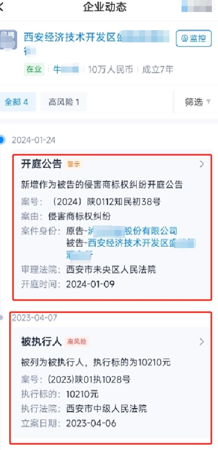 上面信息還顯示該菸酒店涉及2起司法案件,其中一件侵害商標權案今年1月9日還在西安開庭。