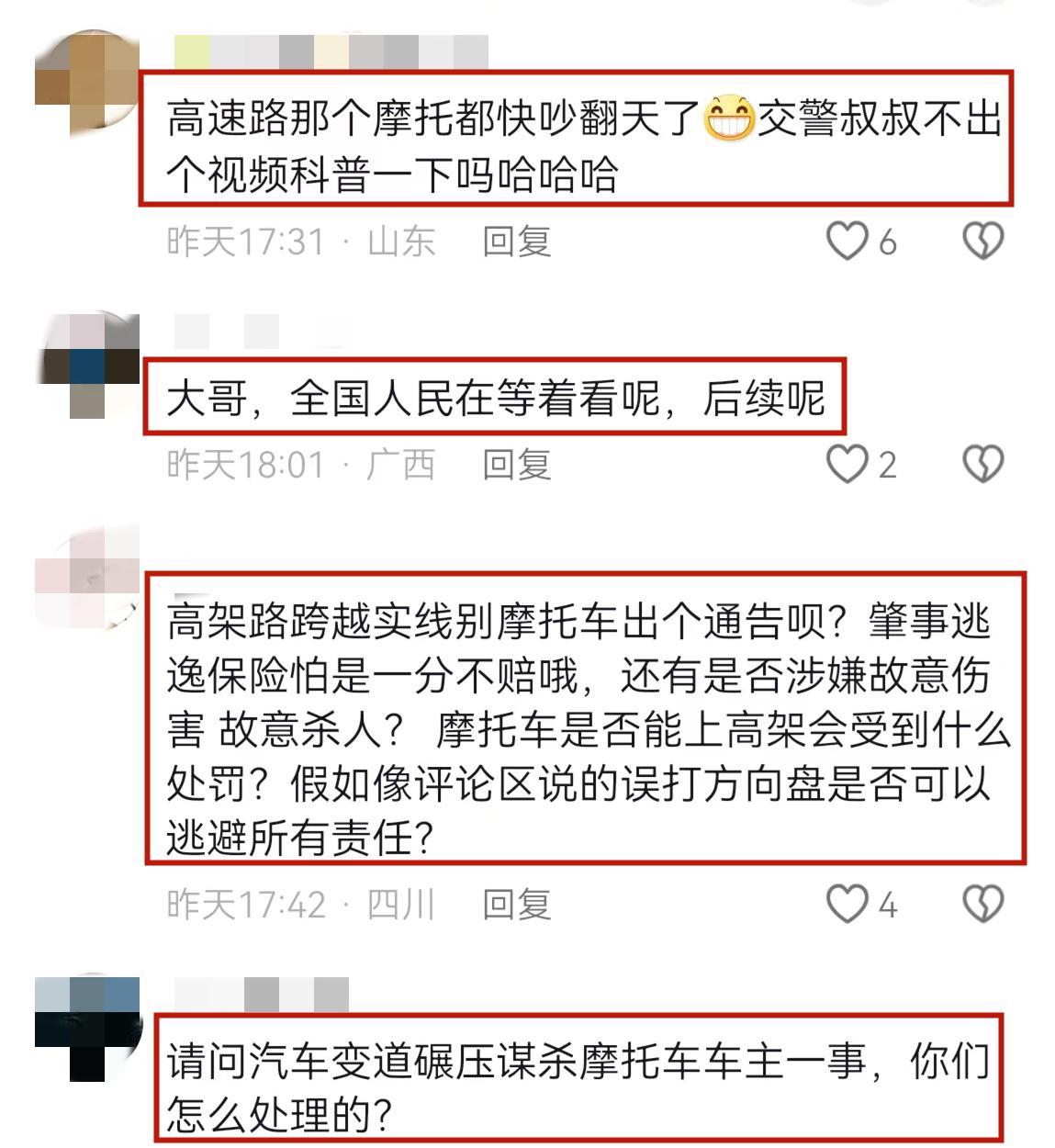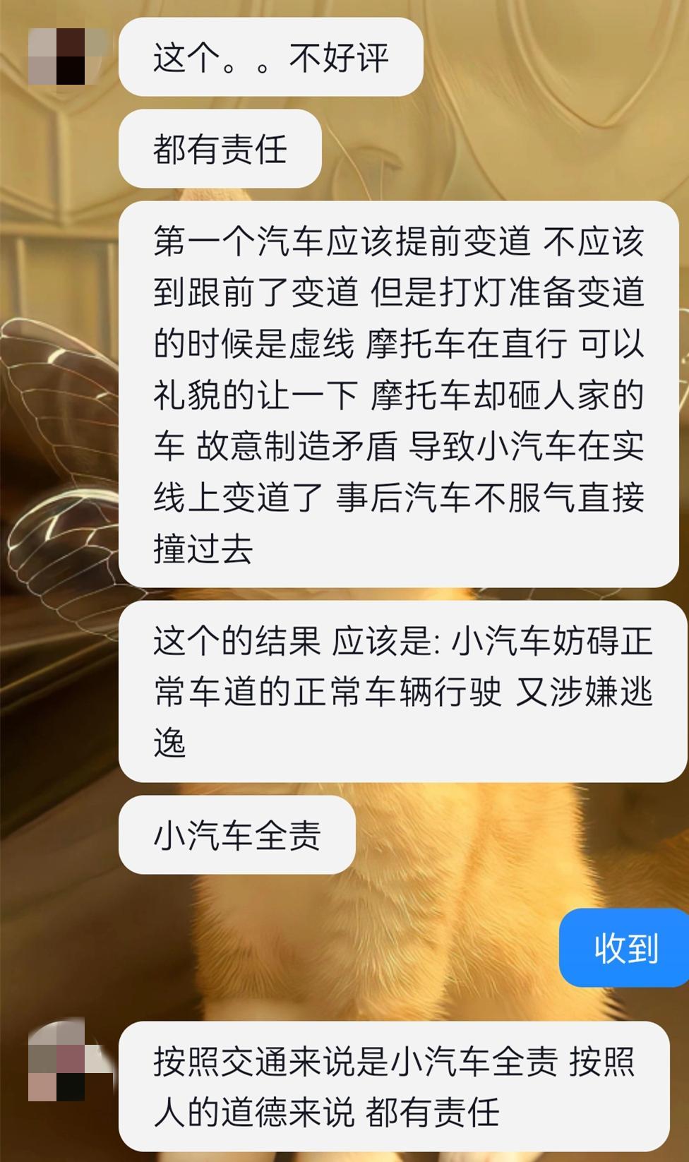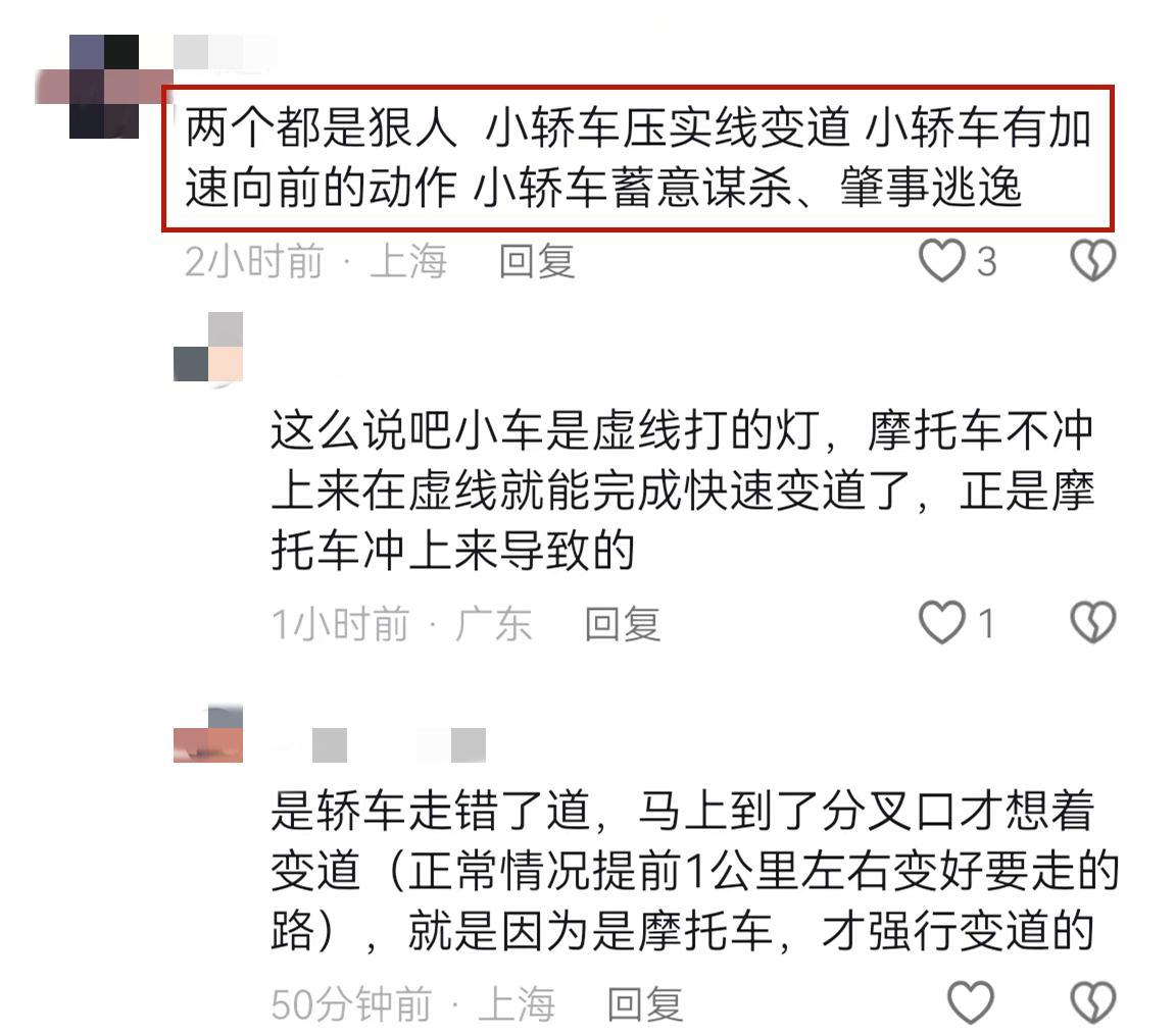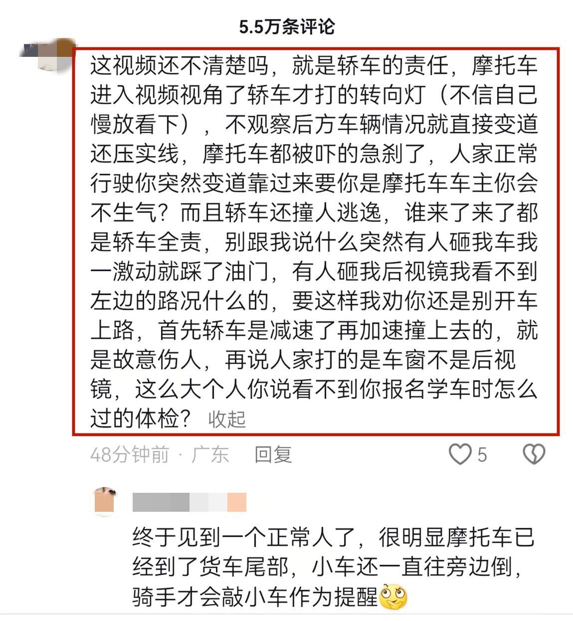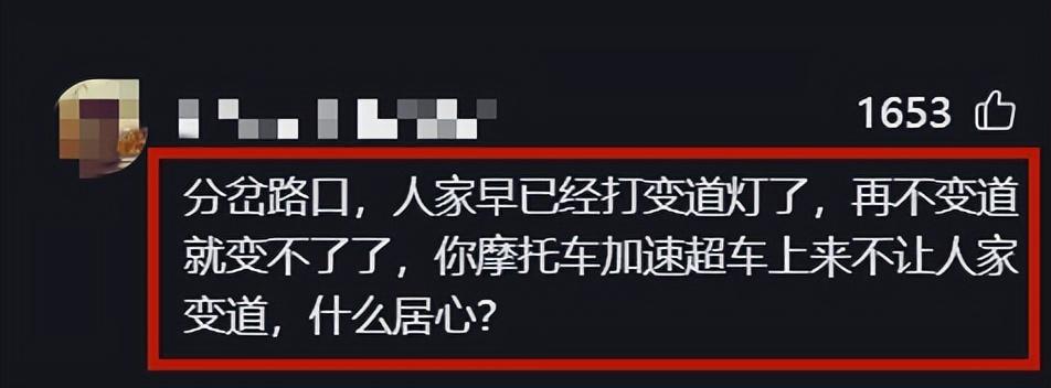 這撥網友認爲此次事件,轎車是主責,直言轎車不觀察後方車輛情況直接變道,還壓實線了,這使得在第二車道正常行駛的摩托車騎手受到了驚嚇,以至於都急剎了。