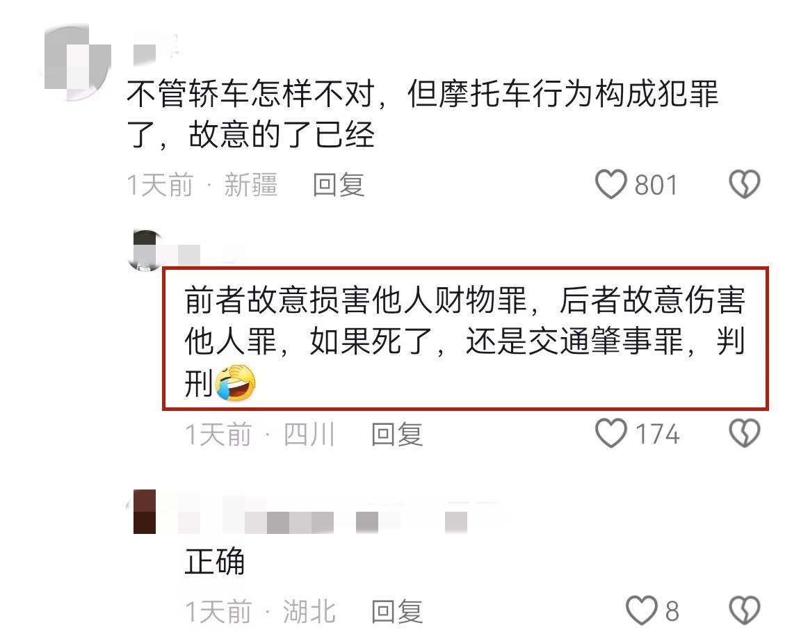 比如有網友說摩托車騎手有損害他人財物罪,轎車車主有故意傷害他人罪和交通肇事罪。