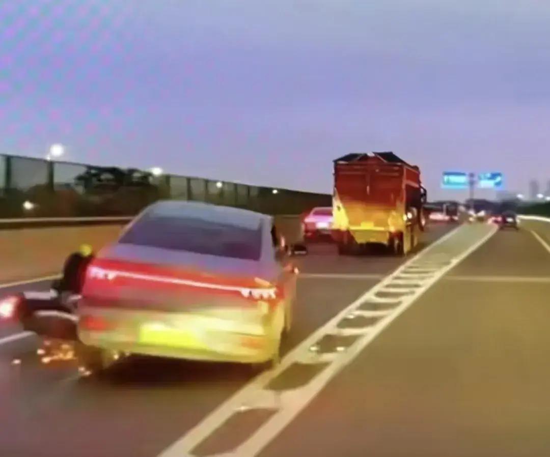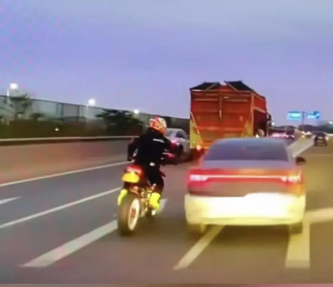 在高架橋上,竟然有摩托車騎手怒砸轎車的車窗,被砸的轎車也不客氣,直接將摩托車撞倒,隨後揚長而去。