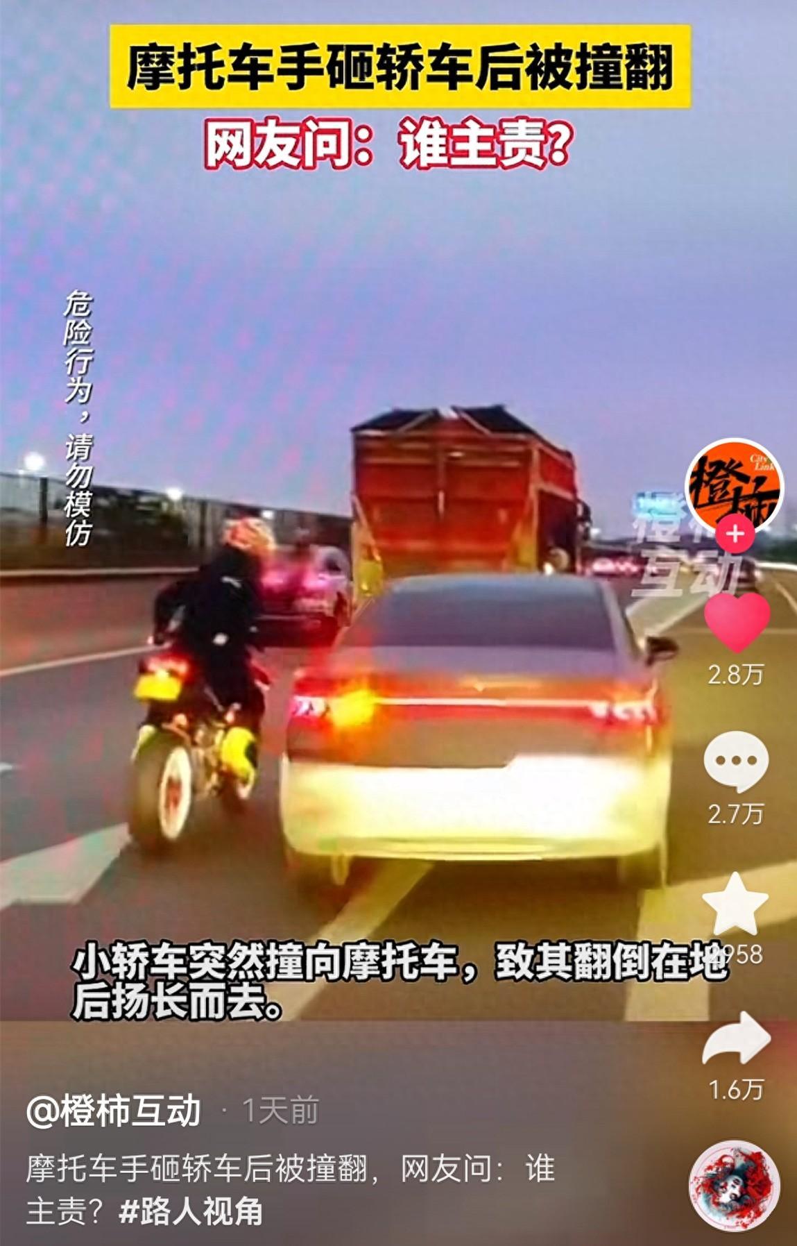 只見轎車車主也沒降速,也沒開窗溝通,他直接開車撞向了摩托車。