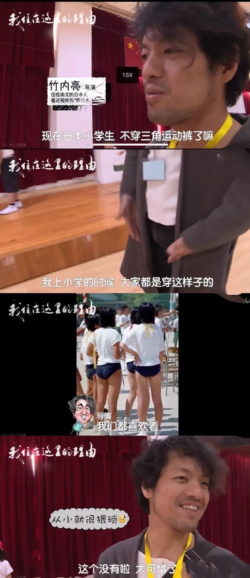 當出現一幫女學生身穿運動短褲的畫面時,竹內亮笑着表達自己的看法,這段視頻截圖,也被做了特殊的標註。