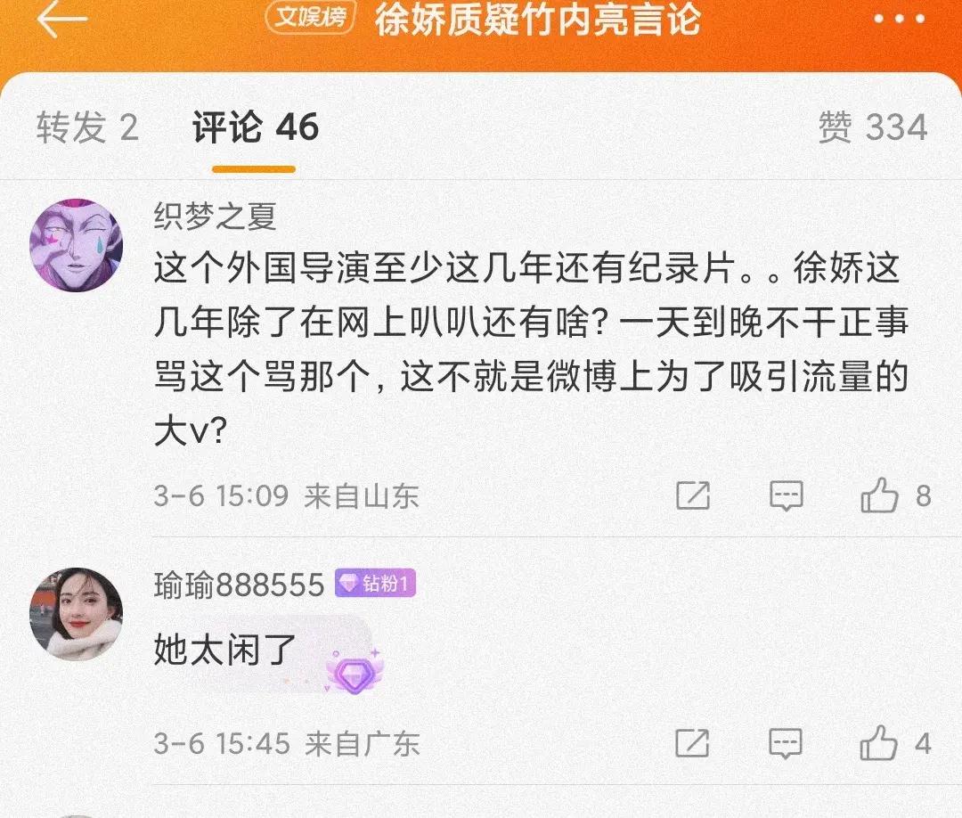 也有一部分人覺得徐嬌之所以質疑竹內亮言論,就是在蹭熱度,沒啥作品,就是太閒了。