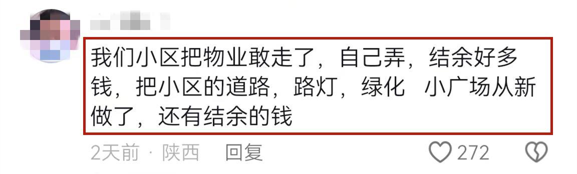 還有陝西的網友說他們小區將物業趕走了,自己弄,將小區的道路、路燈、綠化、小廣場都重新做了,還結餘了很多錢。