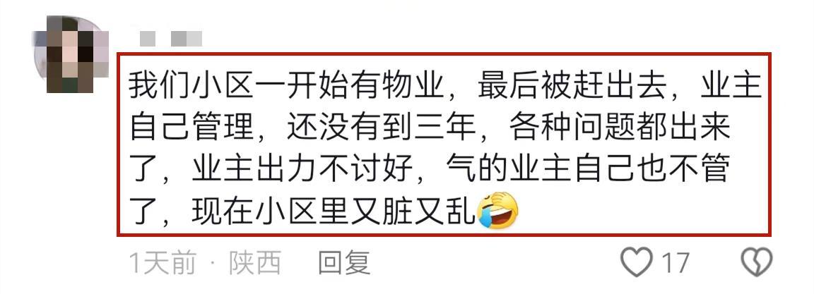 有陝西的網友說他們小區也是將物業趕走了然後自己管理,如今不到3年,各種問題都出來了,業主出力不討好,氣得業主自己也不管了,現在小區裏又髒又亂。