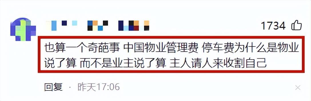 有網友說“也算一個奇葩事,中國物業管理費,停車費爲什麼是物業說了算?而不是業主說了算?主人請人來收割自己。”
