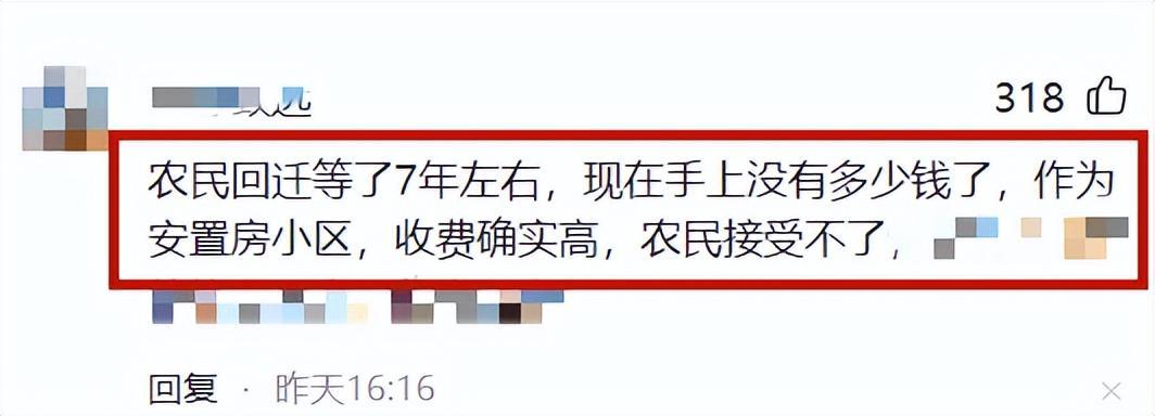 有網友說“農民回遷等了7年左右,現在手上沒有多少錢了,作爲安置房小區,收費確實高,農民接受不了。”