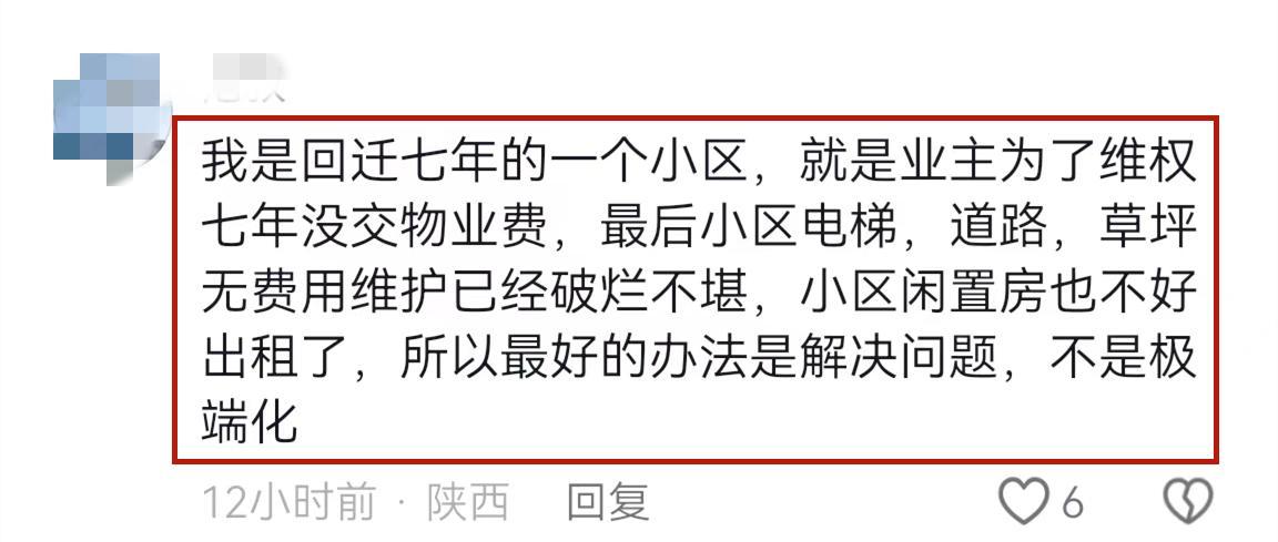 還有陝西的一個網友說他們的小區也是回遷小區,業主們維Q7年沒交物業費,目前小區電梯、道路、草坪無費用維護已經破爛不堪,小區裏的閒置房也不好出租。該網友認爲最好的辦法是解決問題,而不是極端化。