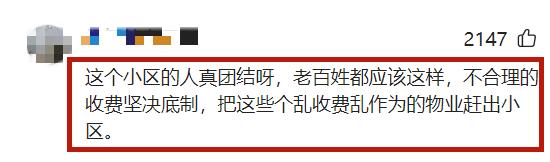 還有網友感嘆“這個小區的人真團結呀,老百姓都應該這樣,不合理的收費堅決抵制,把這些個亂收費亂作爲的物業趕出小區。”