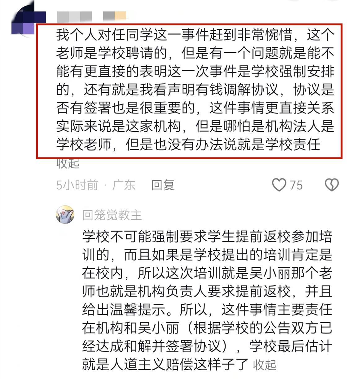 還有網友認爲不能因爲吳某麗是學校的領導,就認定任穎潔的離世學校有責任,也不能因此認定任穎潔是被學校強制安排校外舞蹈集訓。