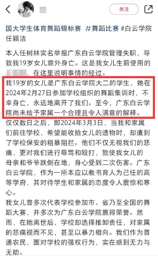 爲了給女兒討一個公道,任穎潔的父親在網上發文怒斥廣東白雲學院。