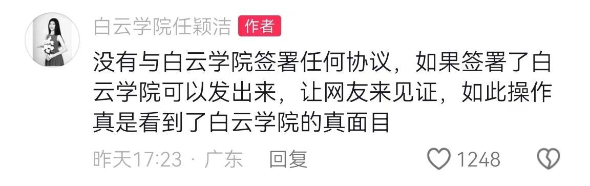在評論區,任穎潔父親還特意強調“沒有與白雲學院簽署任何協議”。