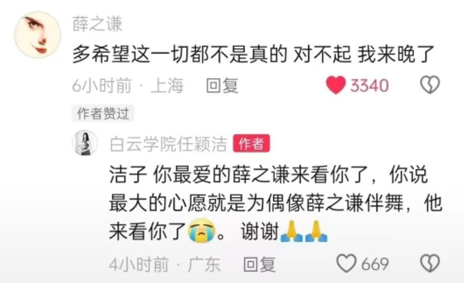 甚至連任穎潔的偶像薛之謙也關注到了此事,薛之謙點讚了任穎潔父親發佈的視頻,並留言:多希望這一切都不是真的,對不起,我來晚了。