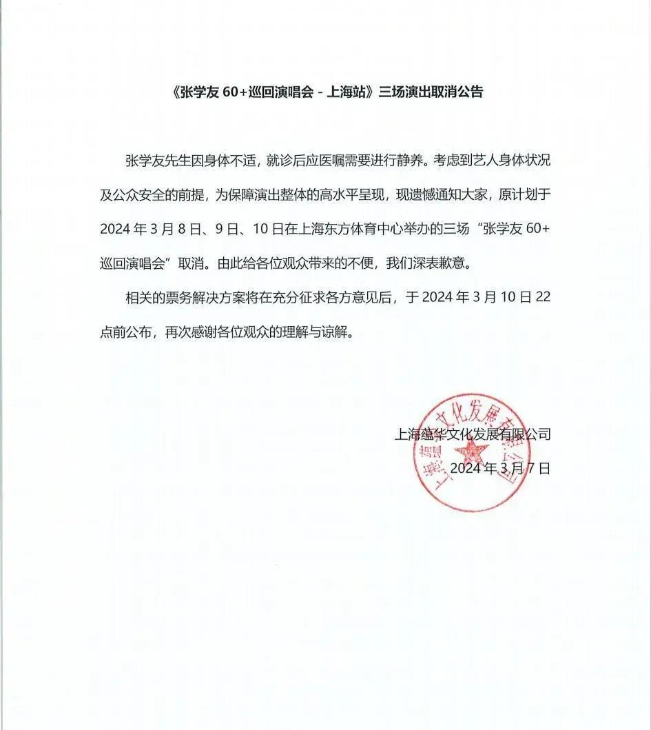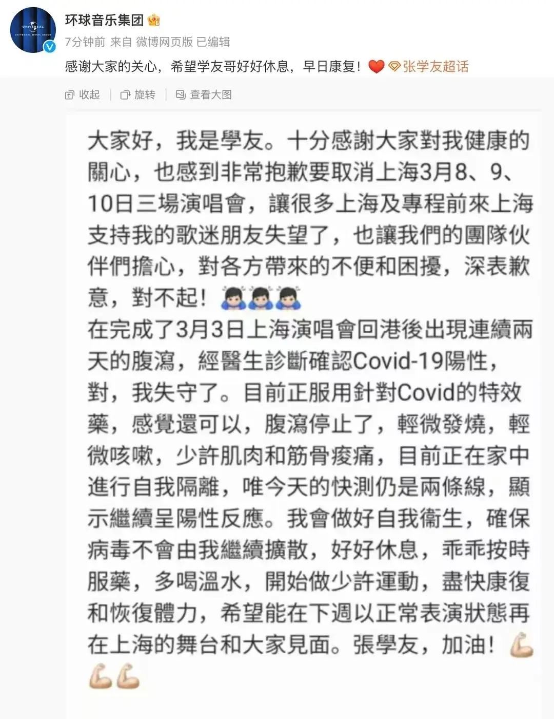 隨後,張學友通過環球音樂集團,親自回應取消演唱會原因。