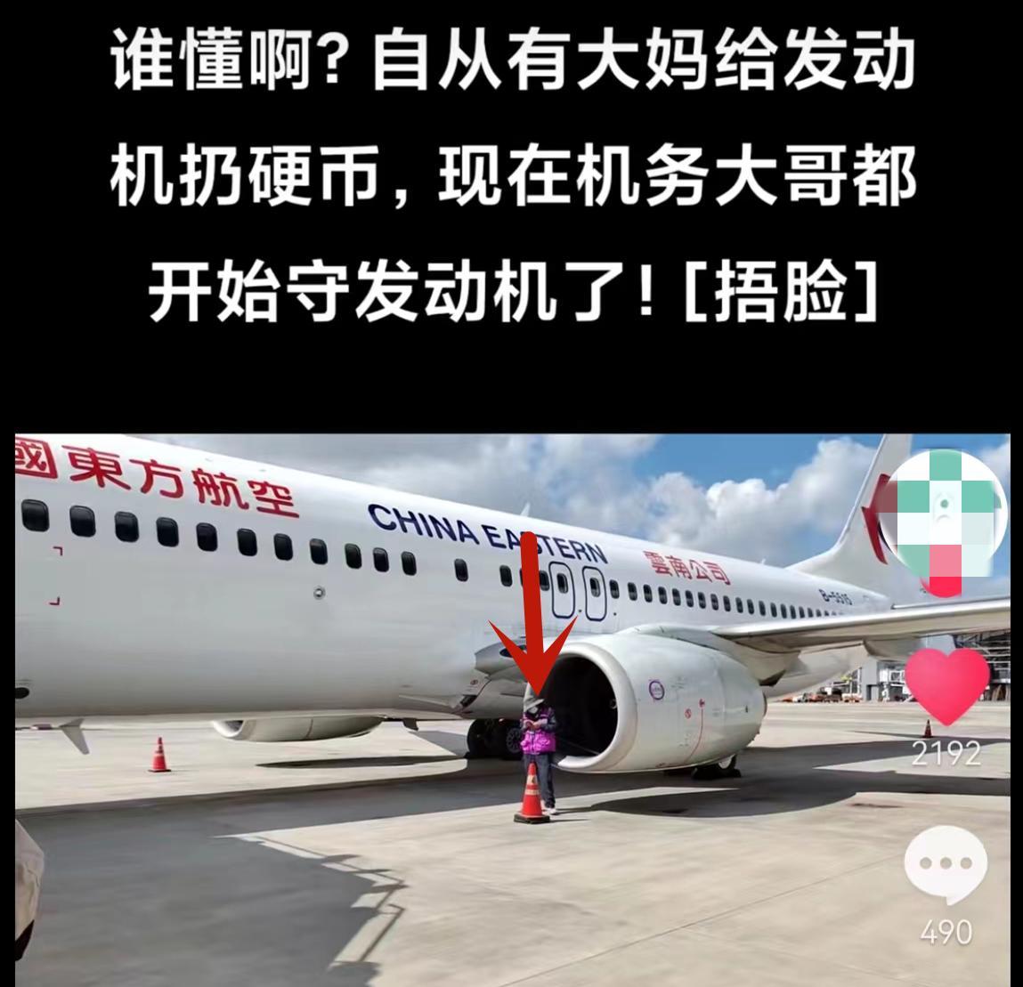 從視頻中還可以聽到機組的工作人員說硬幣扔到地上沒有風險,但扔到發動機裏有風險。