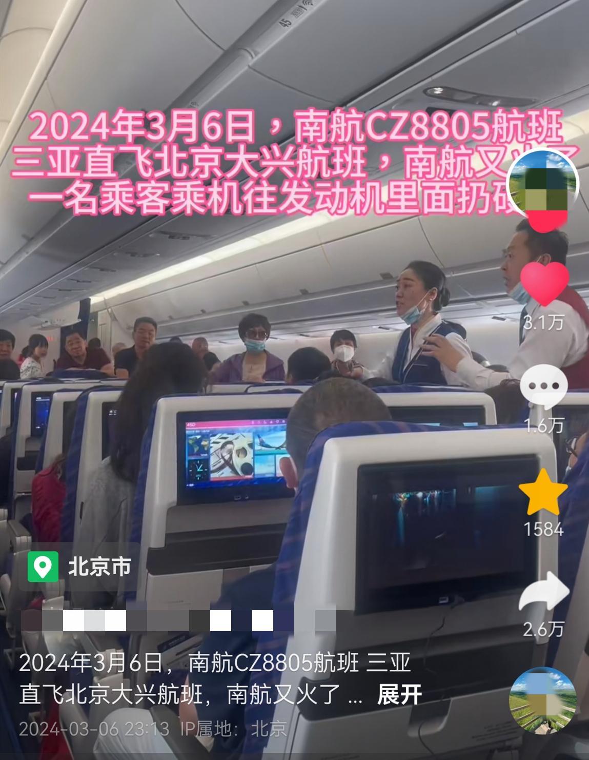 根據網友的爆料可知,涉事的飛機是從三亞飛往北京的南航CZ8805航班。