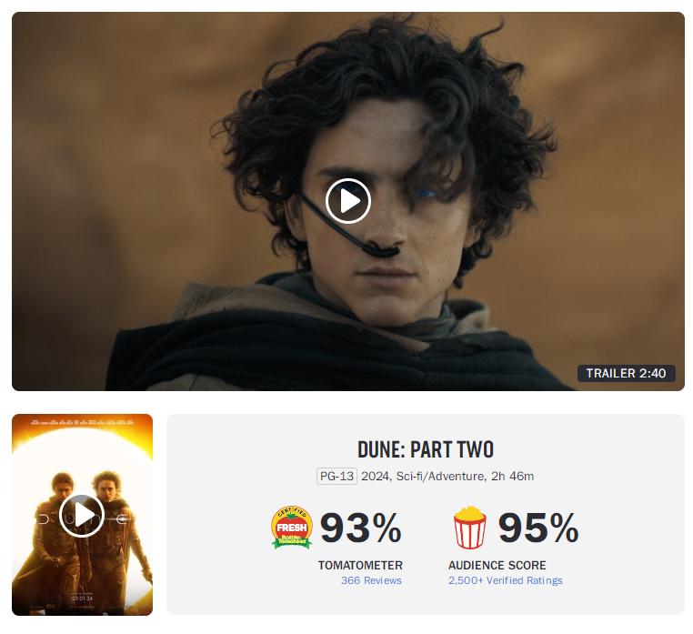 從這兩個數據上來看,《沙丘2》可以說達到了影迷日思夜想的期望,藝術效果與娛樂觀賞都獲得了高度認可。