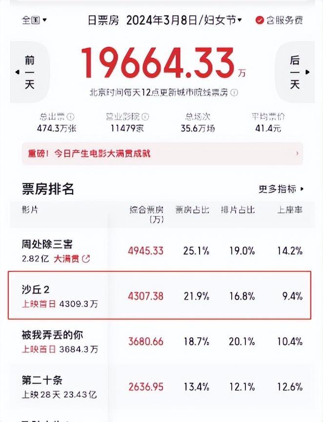 目前《沙丘2》在內地開畫首日票房也不到5千萬,票房成績也僅排在當日的第二名。