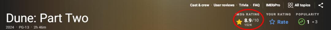 《沙丘2》北美上映時間比內地早了一週,上映後北美的口碑非常好,在IMDb上拿下了8.9的高分。