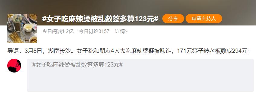 3月8日晚,一名網友在網上發佈了一段視頻,視頻內容主要講述她和朋友被長沙一家麻辣燙店欺詐,遭遇宰客的事情。
