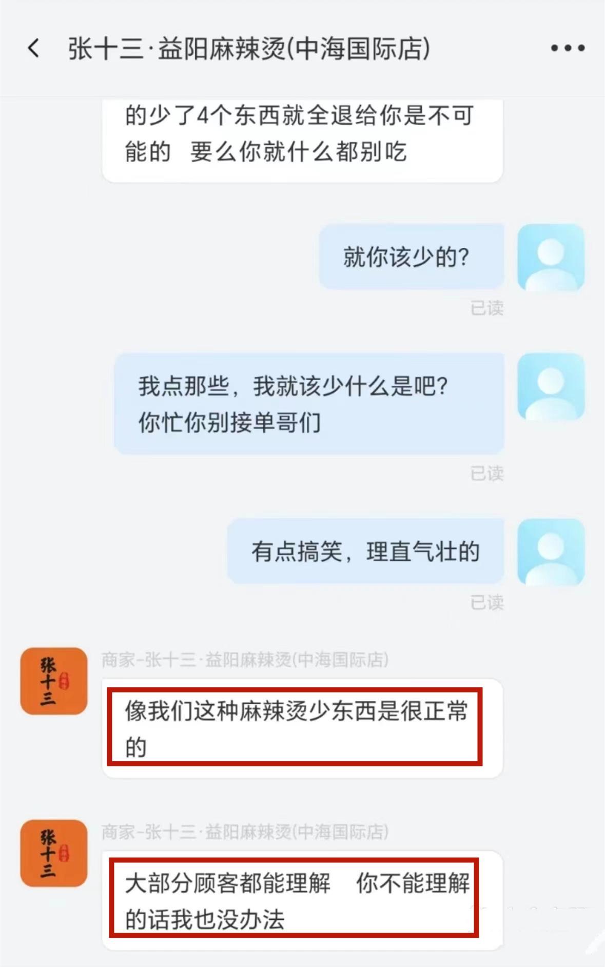 有網友說買了張十三麻辣燙的外賣,結果外賣到了後少了很多東西,他與該店溝通時,工作人員竟然說麻辣燙少東西很正常,還說他理解不了也沒辦法。