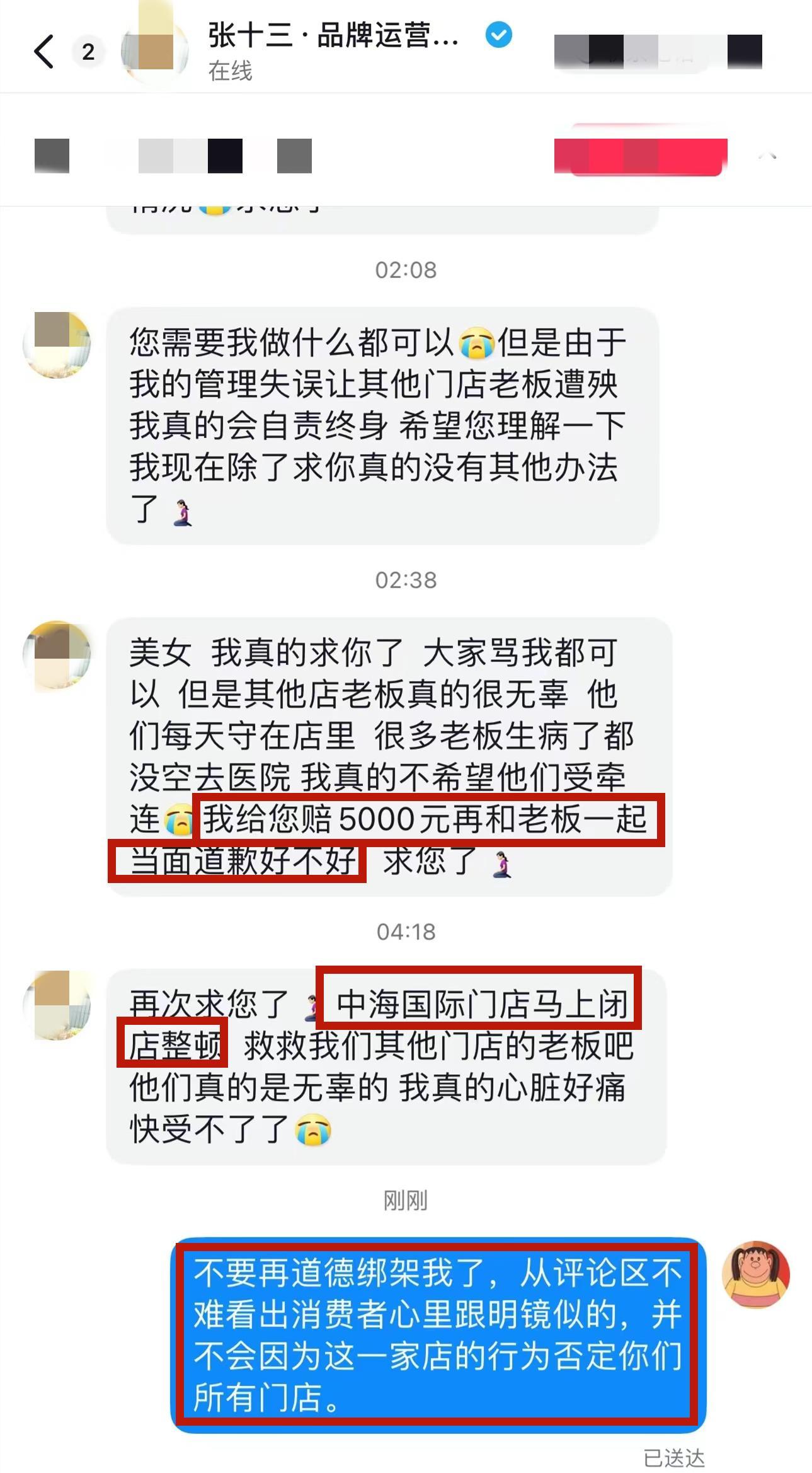 該品牌運營希望爆料網友能夠考慮到其他無辜的該品牌的其他店老闆,刪除視頻,將這件事情的影響降到最低。