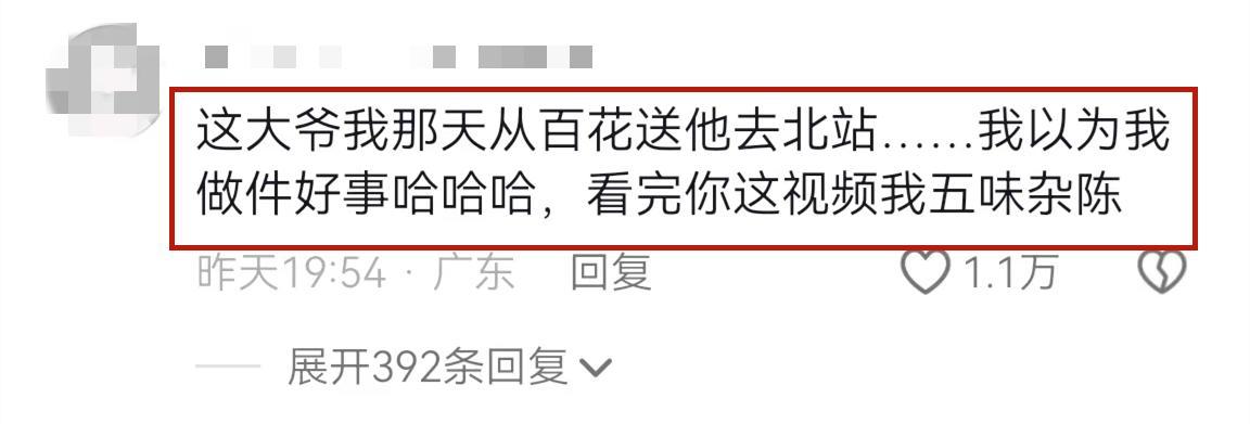 有網友說他曾經從百花送大爺去深圳北站,以爲自己做了一件好事,看到這個視頻她五味雜陳。