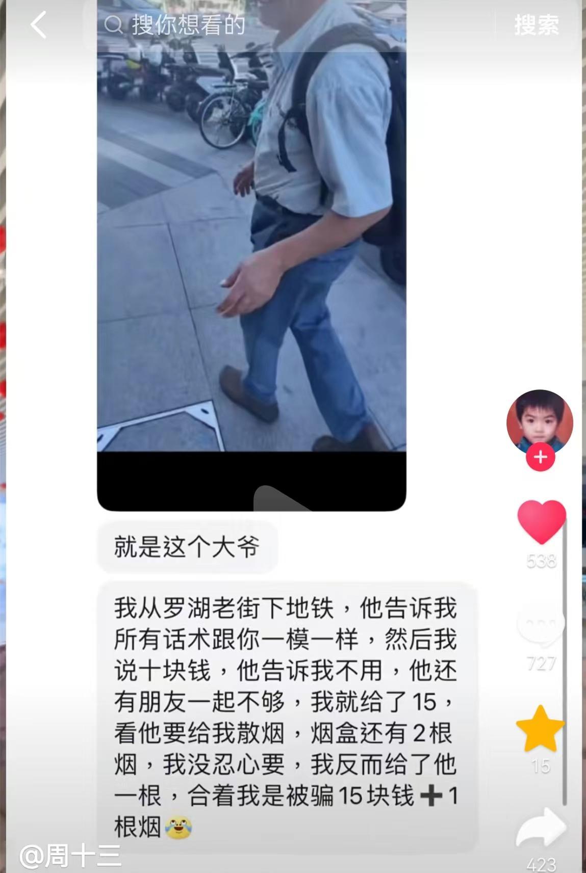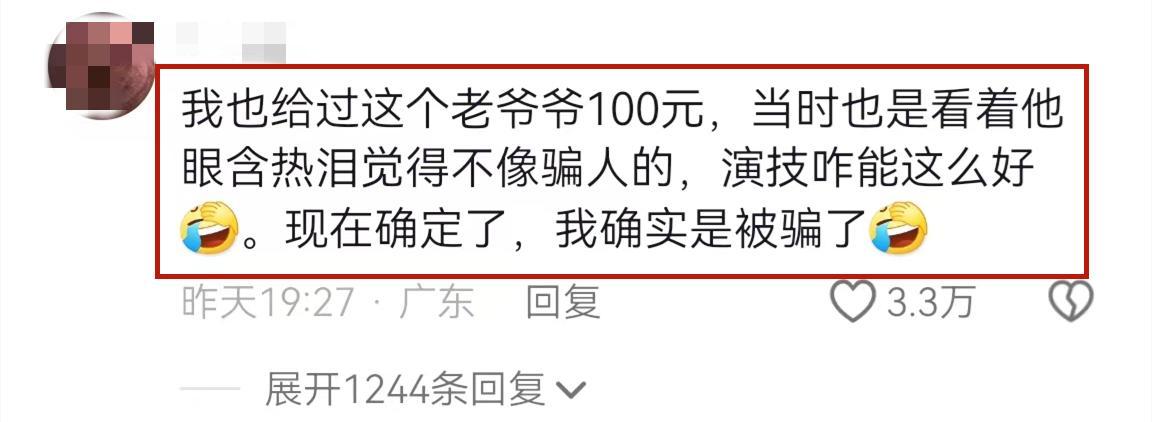 有網友說她也給過這個大爺100元,當時看大爺眼含熱淚不像騙人,沒想到演技這麼好,還是把她騙到了。