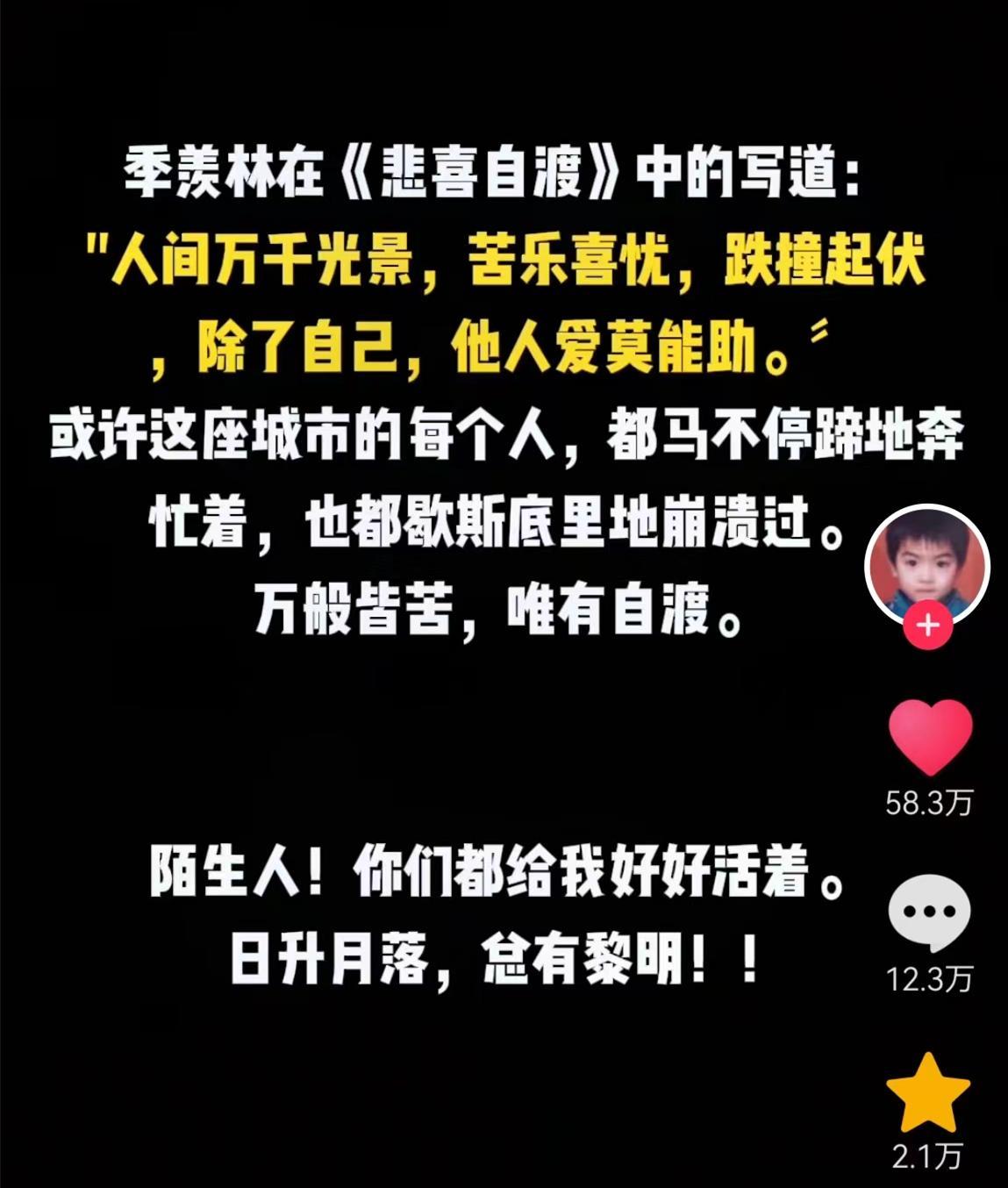 在這段視頻的最後,周十三寫道:陌生人,你們都給我好好活着。日升月落,總有黎明。