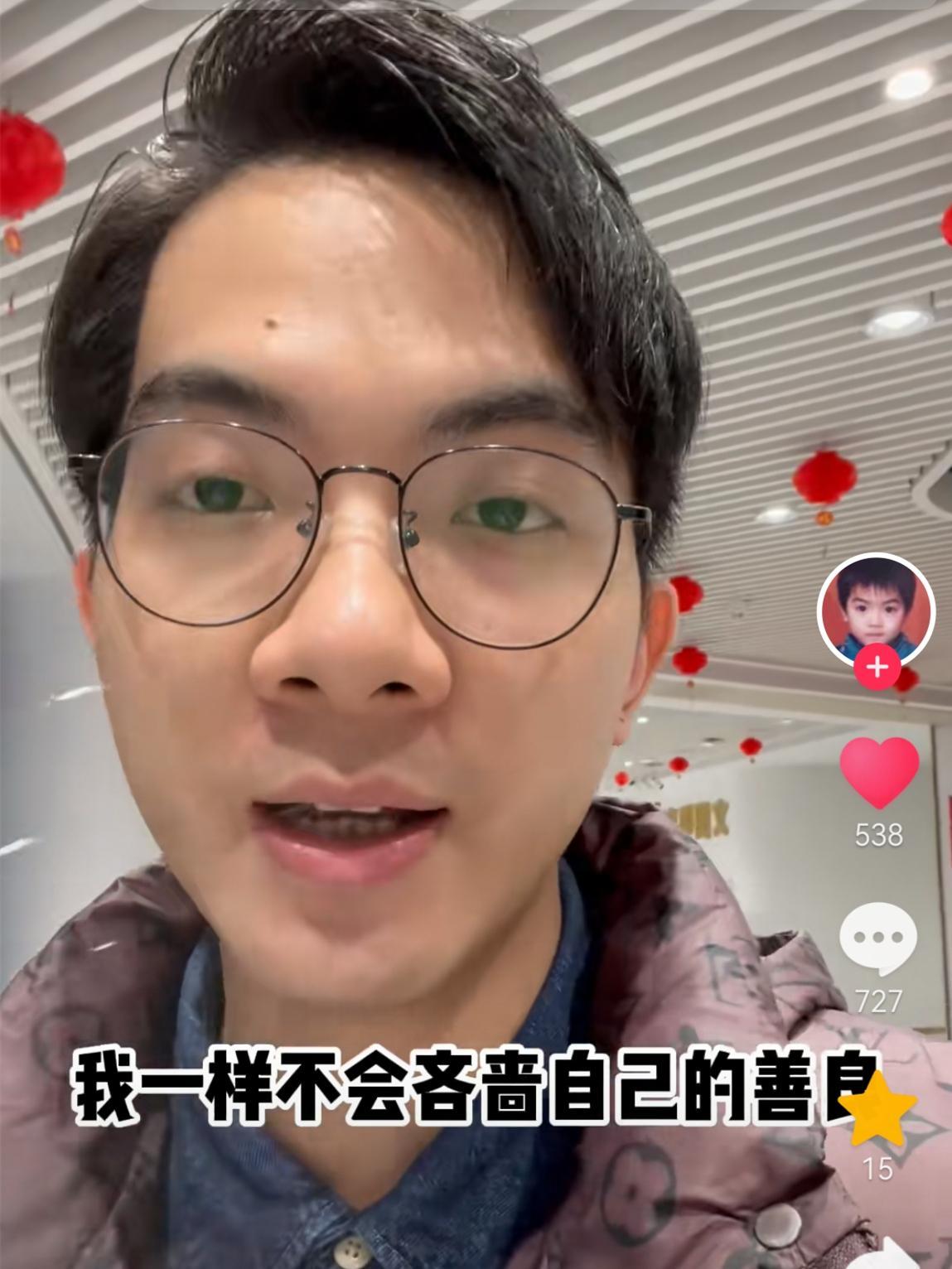 他還說我們的愛心不應該被這些騙子傷害到。但不能因爲被傷害了就不去做善事,他引用電影《第二十條》裏的話說“所有正確的事情都有代價,但不能因爲有代價就不去做。”