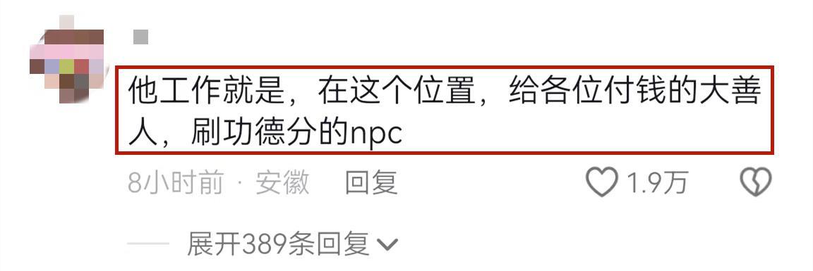還有網友調侃說“他工作就是在這個位置給各位付錢的大善人刷功德分的npc。”