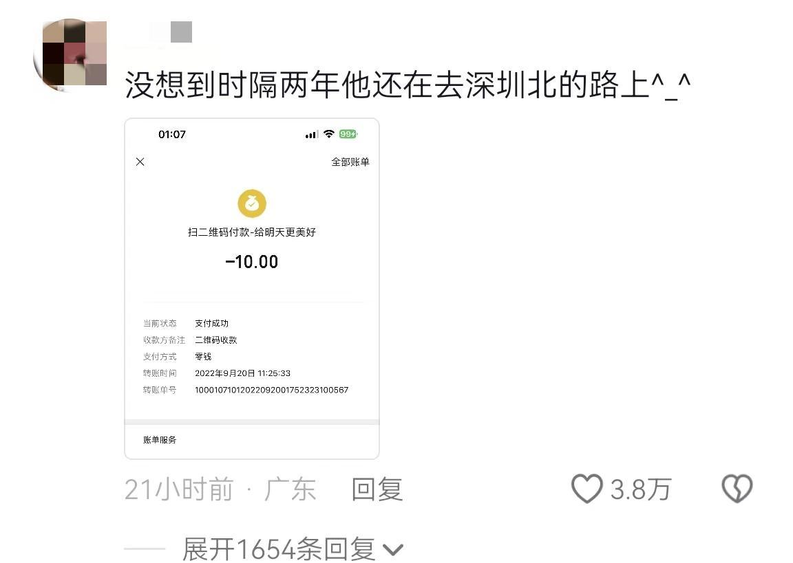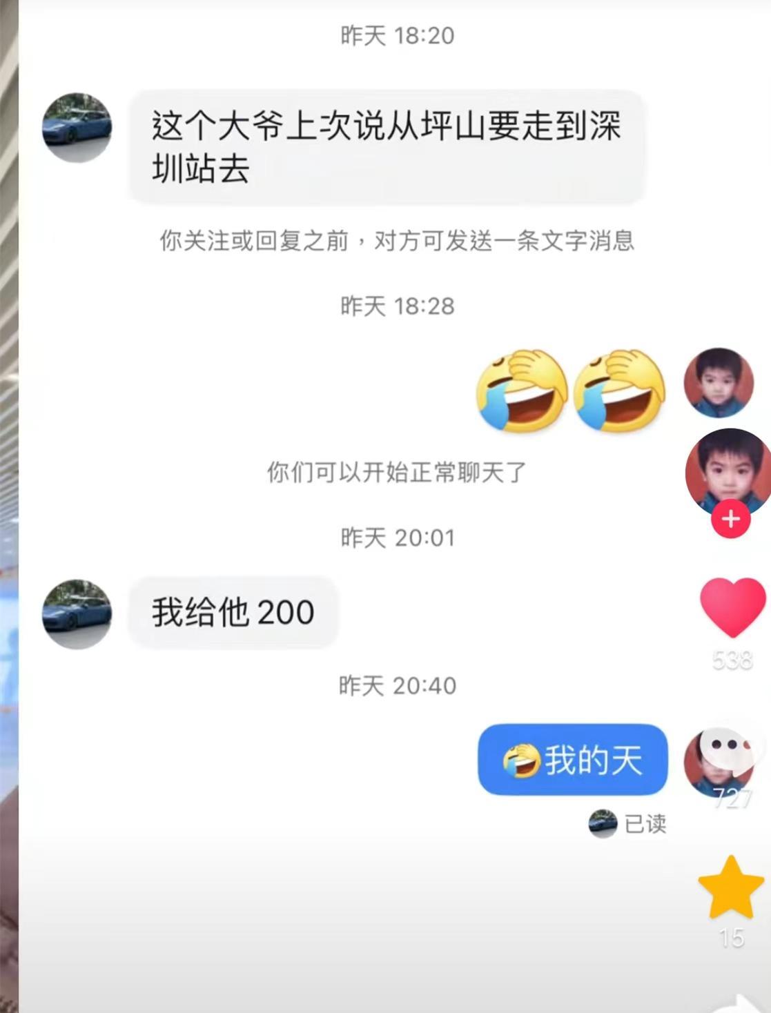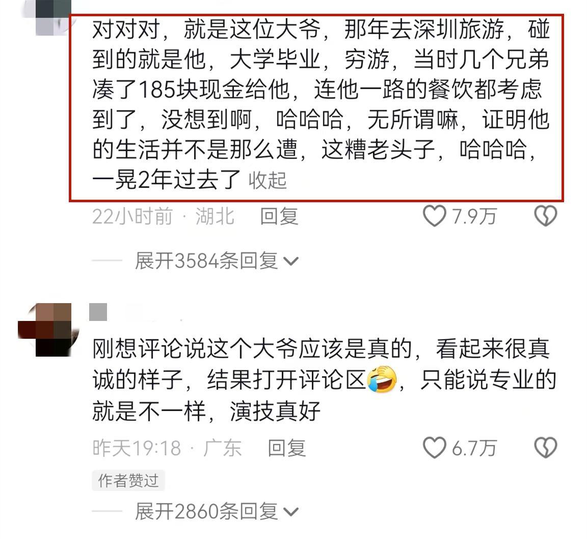有網友說他之前大學剛畢業和幾個朋友去深圳窮遊,也遇到了這位大爺,當時大家一起湊了185元現金給大爺。