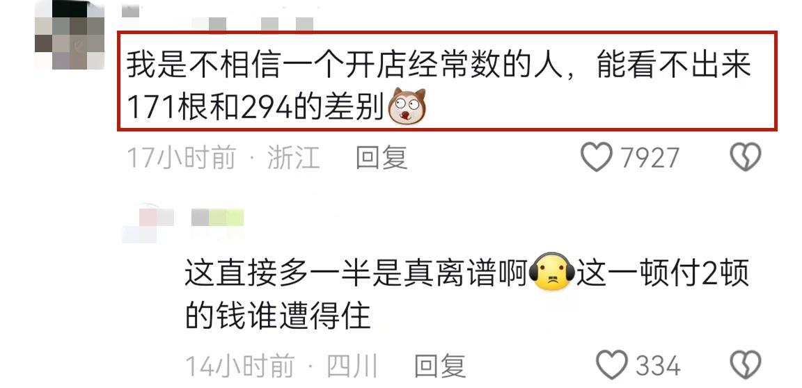 更多網友更是直言作爲經營麻辣燙的店老闆,不可能看不出171元的籤子和294元的籤子數量的區別,還說店老闆是慣犯,坑了不少人,只是這次被發現了。