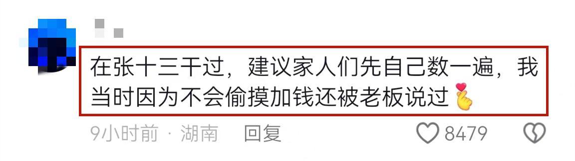 前員工說“在張十三幹過,建議家人們先自己數一遍,我當時因爲不會偷摸加錢還被老闆說過”。