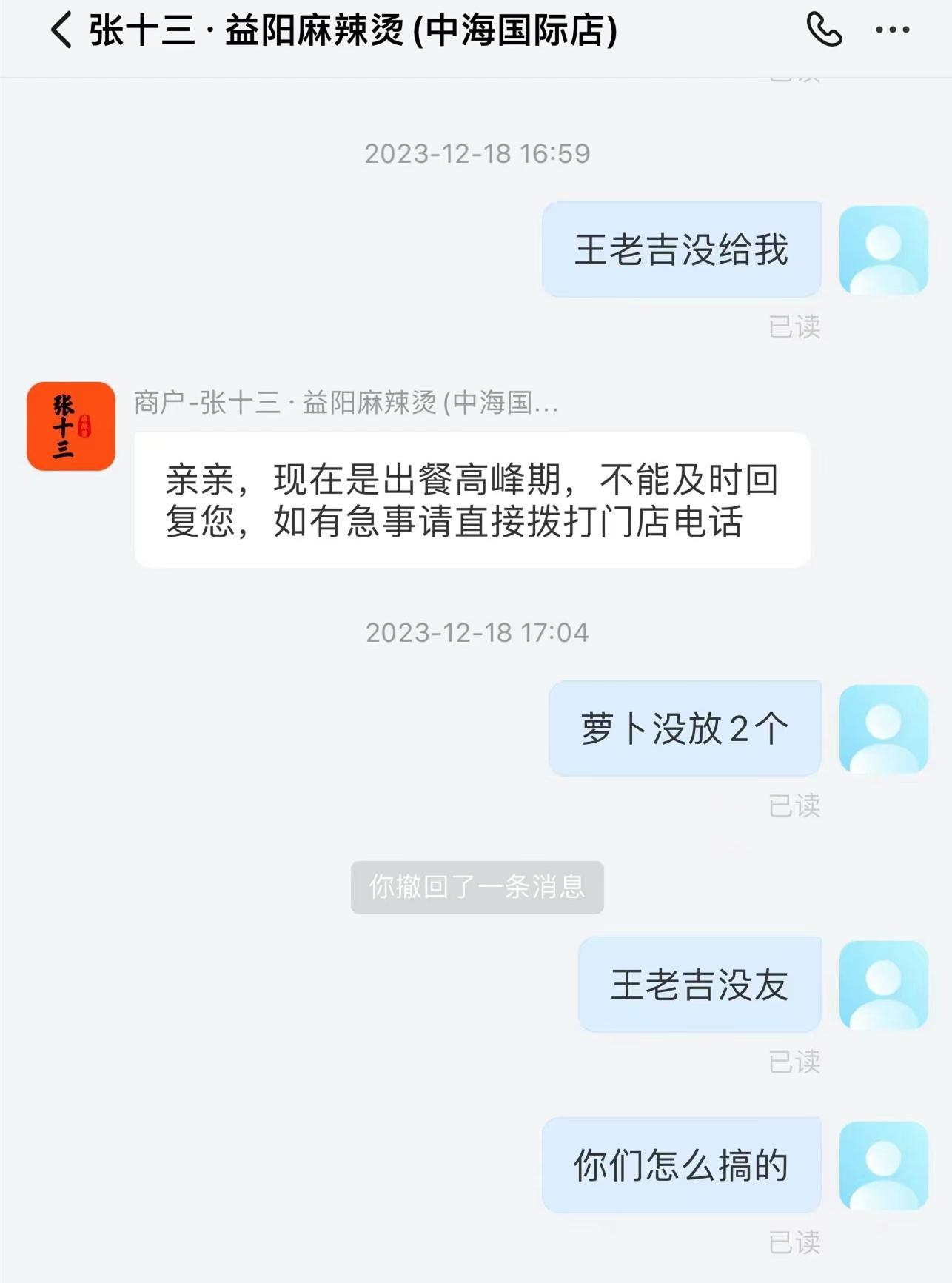 有網友說買了張十三麻辣燙的外賣,結果外賣到了後少了很多東西,他與該店溝通時,工作人員竟然說麻辣燙少東西很正常,還說他理解不了也沒辦法。